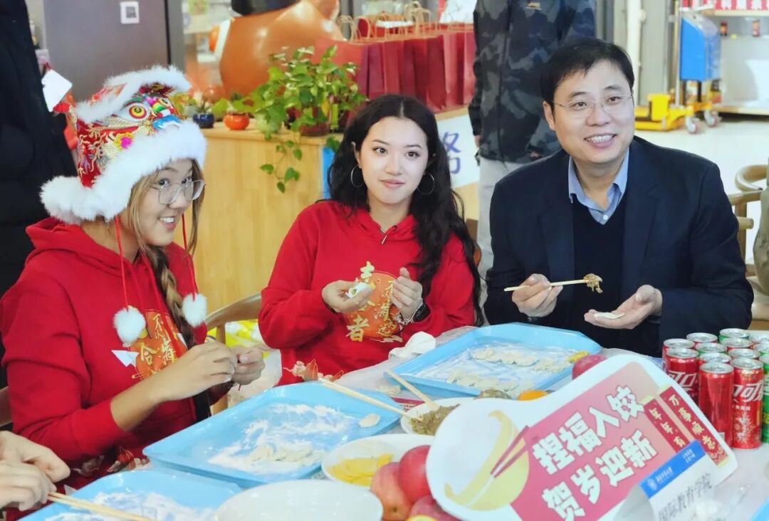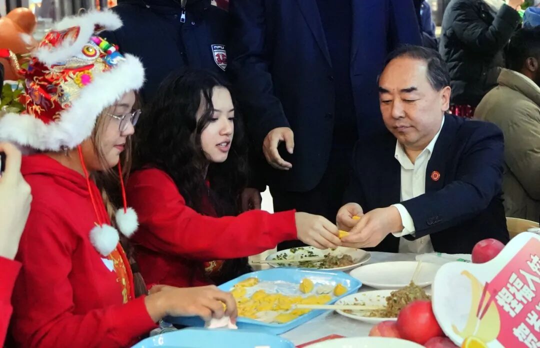 That evening, the university held a grand New Year dumpling-making event. Li Yanrong, Chairman of Board of Trustees of NPU, Lü Weidong, Vice Chairman of Board of Trustees, and Vice President Yue Xiaokui attended the event and welcomed the New Year together with international students. Frequent interactions between teachers and students created a warm and lively atmosphere. Many international students, dressed in festive red outfits, enthusiastically experienced the processes of filling and folding dumplings with the help of teachers and classmates. Although their techniques were still a bit unpolished, through collective effort, dumplings of various shapes—symbolizing reunion and good fortune—gradually took form. University leaders mingled with international students, kindly inquiring about their studies and daily life and extending New Year greetings. Teachers and students sat together, enjoying a scene filled with harmony and festive cheer.