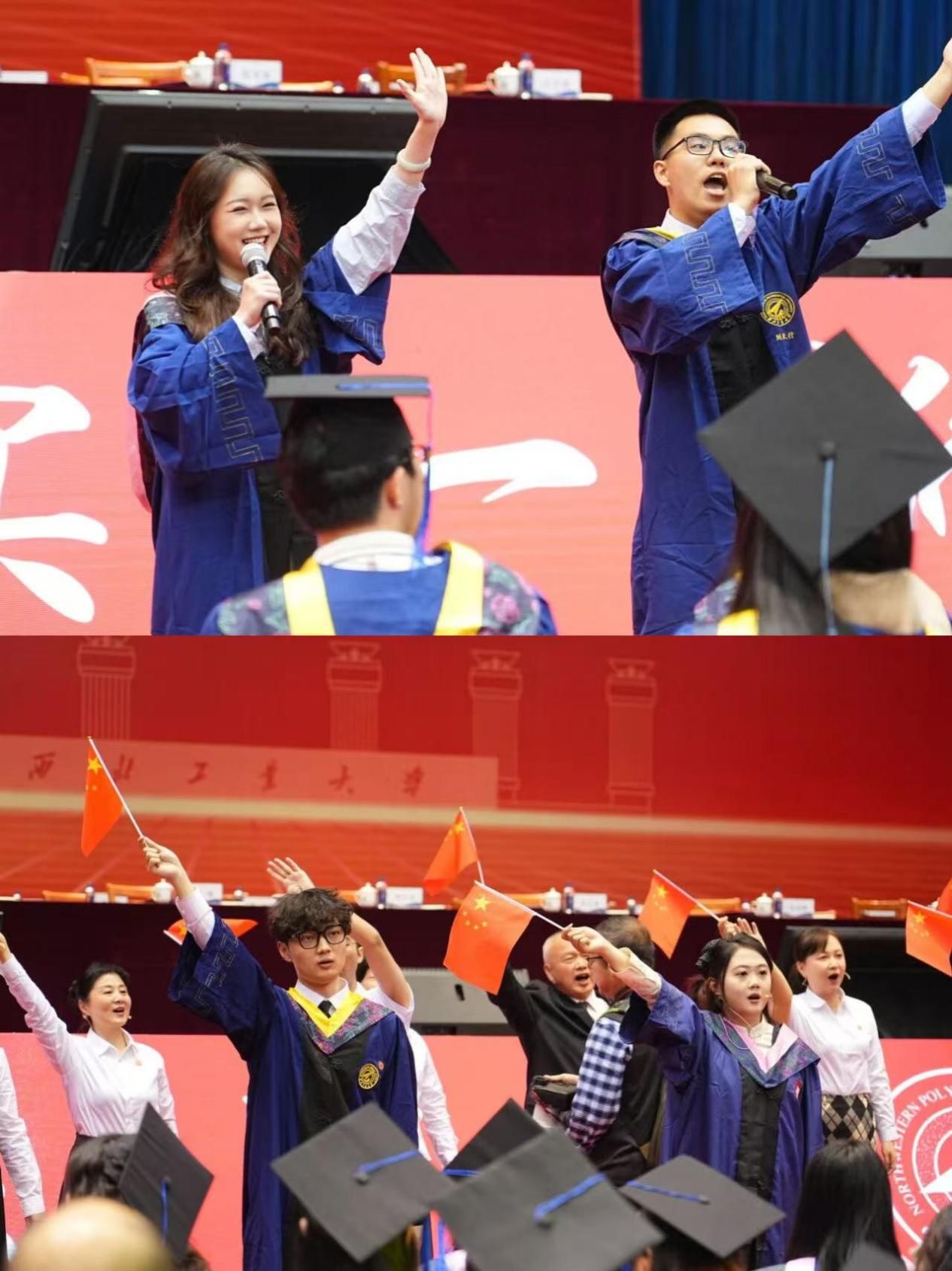 At the end of the ceremony, all attendees stood up and sang the "Anthem of NPU" together. Amidst the passionate and stirring melody, a giant university flag slowly passed over the heads of the graduates. The song lingered long in the air, stirring the hearts of all present.