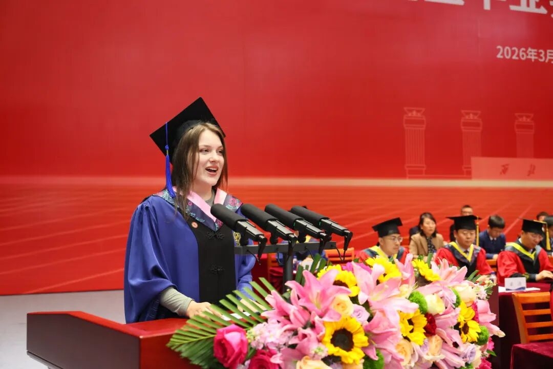 PIATNITSKAIA ALEKSANDRA (Xin Wei), a Russian international student from the School of Management, delivered a speech as a graduate representative, sharing her story at NPU. She recalled her confusion when she first arrived at NPU eight years ago, and shared her journey from being too afraid to speak Chinese to confidently standing on the commencement stage. She said that in the future, she would carry forward the knowledge and friendships she gained at NPU to dedicate herself to cultural exchanges between China and Russia. Finally, she adapted the lyrics of the farewell song "Farewell" and expressed her heartfelt emotions: "The Sanhang Road, the library, green grass reaches the sky. Evening breeze brushes the willows, with qin’s gentle strains in the air, NPU remains in my heart. I love you, NPU. I love you, China!"