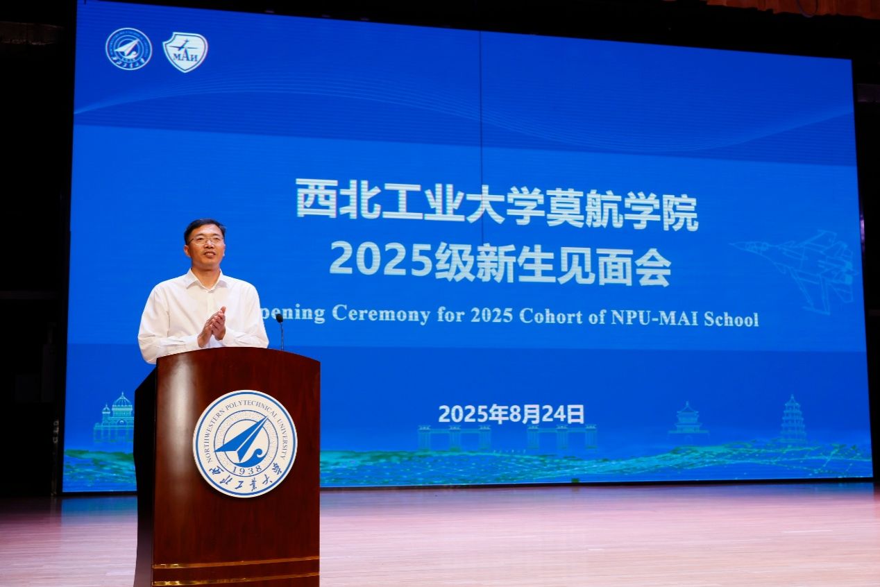 On August 24, NPU-MAI Joint Institute held first freshmen orientation at the AoXiang Student Centre on the Chang’an Campus. Vice President of NPU Yue Xiaokui, Deputy Minister of Advanced Scientific Programs of the Russian Academy of Aviation Oleg Simonov, Deputy Director of the International Department and Executive Vice Dean of Moscow Aviation Institute, Evgeny Neretin, Head of the Education Department Aleksandr Ermakov, Head of International Programs Anastasiia Kovaleva, Director of the International Cooperation Office Kong Jie, Director of the Planning and Finance Department Han Suo Min, Director of the Party Committee's Student Affairs Department Wu Wenchuan, Secretary of the Youth League Committee She Leilei, Director of the Admissions Office and Deputy Director of the Academic Affairs Department, Wang Ke Qin, Deputy Director of the International Cooperation Office Xiang Dan, Vice Dean of the School of Electronics and Information Yao Rugui, Assistant to the Dean of the School of Aeronautics Ye Kun, Assistant to the Dean of the School of Astronautics Guo Ning, along with other responsible officials of NPU-MAI Joint Institute, the entire freshman of 2025, and representatives of their parents jointly witnessed this historic moment. The ceremony was presided over by Dai Fuping, the Secretary of the Party Committee of NPU-MAI Joint Institute.