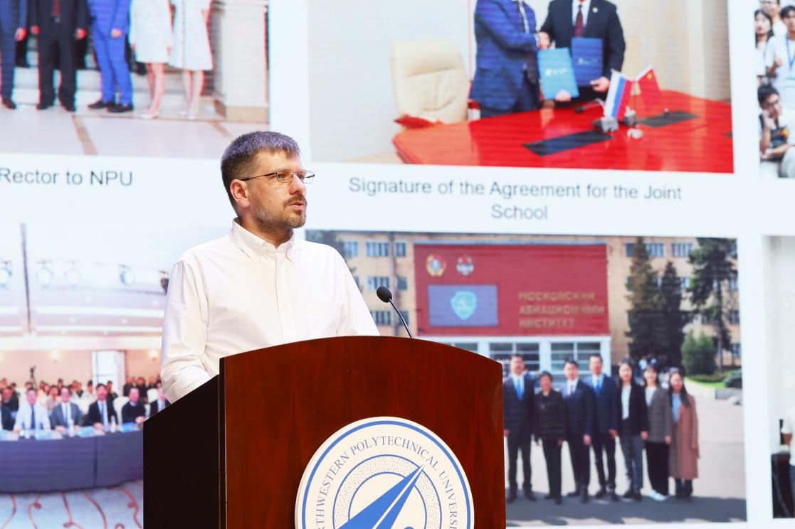 Evgeny Neretin delivered a speech on behalf of Moscow Aviation Institute(MAI). In his address, he introduced the history and educational features of NPU-MAI Joint Institute and reviewed the significant achievements made since the establishment of the cooperative relationship between the two universities. Focusing on the four core aspects of the cooperative education program, he outlined the future research and engineering practice directions that students will be exposed to during their studies. He emphasized that the exploration of aeronautics and astronautics is a common human endeavor that transcends borders and connects dreams. He hoped that students would commit themselves to scientific exploration and technological practice with a spirit of excellence, continuously enhancing their innovation capabilities and engineering practice skills, and strive to become a bridge for Sino-Russian scientific, technological, and cultural cooperation. He noted that the first-year student welcome party of NPU-MAI Joint Institute marks a key milestone in the cooperation between the two universities in the field of talent cultivation. He encouraged students to cherish the valuable learning platform built through Sino-Russian university cooperation, not only to acquire solid professional knowledge and skills but also to bravely explore the infinite possibilities of aeronautics and astronautics.